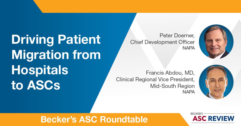 During Becker’s 28th Annual Meeting: The Business & Operation of ASCs, in an executive roundtable sponsored by North American Partners in Anesthesia (NAPA), Francis Abdou, MD, Clinical Regional Vice President for NAPA’s Mid-South Region, along with Chief Development Officer & EVP, Peter Doerner, and other NAPA leaders, facilitated a discussion about how reinforcing the role of anesthesia at ASCs can facilitate increased patient volumes.