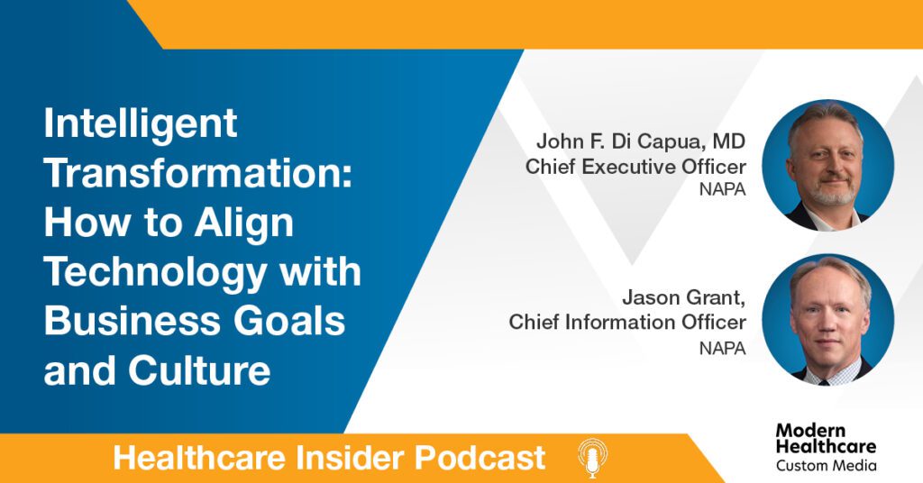 In this episode of Healthcare Insider, Dr. John Di Capua, the CEO of North American Partners in Anesthesia, commonly known as NAPA, and Jason Grant, the senior vice president and chief information officer, describe how the company recently successfully implemented and scaled a new integrated technology system that went beyond just IT, an effort leadership describes as Intelligent Transformation. Di Capua and Grant also explore how clinical staff have been impacted and the change management required.